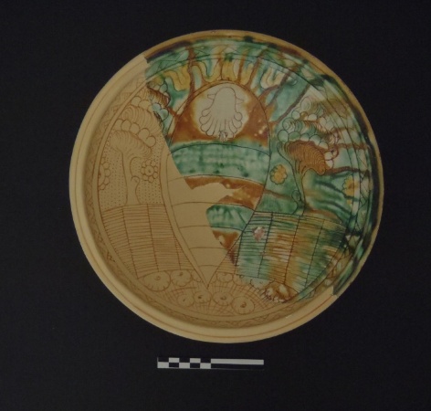 Descrizione Piatto-bacile a vasca troncoconica, carenato sul lato esterno, con orlo riquadrato, caratterizzato da leggera gola nella parte superiore; piede a disco profilato, dal contorno irregolare. Il decoro mostra al centrouno scudo ogivale con svolazzi e ‘rosette’ ai lati, recante lo stemma della famiglia Rangoni, caricato di conchiglia in capo, con fasce orizzontali campite alternatamente in ramina e ferraccia. Lo sfondo mostra la siepe a graticcio e due alberi, con traccia di prato, mentre il fregio periferico, al di cotto dell’orlo, contiene un nastro spezzato e intrecciato. L’ingobbio riveste l’interno, all’esterno ricopre l’orlo; la vetrina è trasparente e riveste entrambi i lati, ad esclusione del piede. Al centro della vasca sono riconsocibili i segni di appoggio del treppiede. Colori: giallo ferraccia/giallo antimonio/verde ramina.