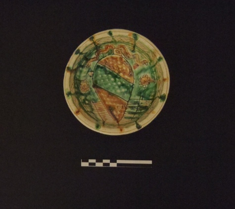 Descrizione Ciotola emisferica con orlo everso, leggermente ingrossato; piede a disco, profilato ed incavato. Il decoro è costituito da uno scudo ogivale bandato di tipo generico, dipinto a graticcio, con svolazzi sulla sommità e ‘rosette’ ai lati; sullo sfondo sono presenti l’hortus conclusus e il prato. La parete mostra un fregio con nastro spezzato intrecciato. Sul retro, sotto l’orlo, corre una sequenza continua di linee parallele, intercalata da pennellate in ramina e ferraccia. L’ingobbio e la vetrina ricoprono entrambi i lati, all’esterno fino a circa tre/quarti; la vetrina è trasparente. Sulle parti originali dell’orlo sono visibili degli addensamenti di pigmento, mentre al centro della vasca si riconoscono i segni di appoggio del treppiede. Colori: giallo ferraccia/verde ramina.
