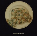 Il decoro si compone di un clipeo al centro del cavo, contenente un fiore qadrilobato e tralci vegetali. Sulla parete si susseguono delle palmette alternate a foglie cuoriformi, mentre la tesa è ornata da un fregio con motivi vegetali. Le decorazioni sono graffite a stecca. L’ingobbio e la vetrina rivestono entrambi i lati, all’esterno coprono il piede. Si riscontrano i segni d’appoggio del treppiede al centro del cavo. Sul lato esterno si distinguono delle solcature parallele, lungo tutta la circonferenza. Colori: giallo antimonio/verde ramina/blu.