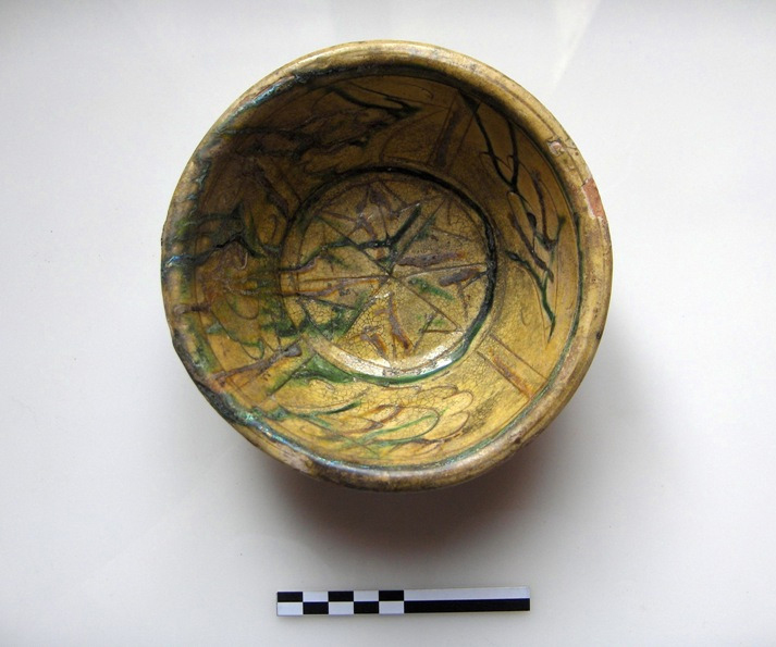 Descrizione Ciotola integra; vasca troncoconica con orlo indistinto e fondo apodo, leggermente profilato nel punto di raccordo con la parete; ingobbio interno, all’esterno riveste solo l’orlo. La vetrina copre le zone ingobbiate, risparmiando l’esterno (ad eccezione dell’orlo; inoltre, tracce