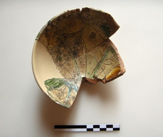 Bibliografia: Forma: GUARNIERI et al. 2006a, fig. 11.54; decoro: Ibid., tav. XV.66, 69 (schema simile, con quattro foglie nascenti da un uno stesso fusto, in questo caso alternatamente campite a bande graffite e a graticcio dipinto); vd. anche il catino da scavi nel Castello Estense (torre di S.