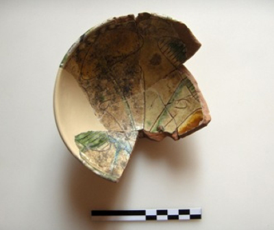 … [leggi tutto]mostra un motivo vegetale, foglie cuoriformi, alternatamente campite a bande oblique graffite o solo dipinte, riunite in un mazzo. Al centro del cavo si nota l’appoggio del treppiedi. Colori: giallo ferraccia/verde ramina. ArcTa con ingobbio e vetrina solo all’interno