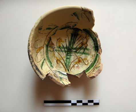 rappresentato da una palmetta stilizzata entro cornice circolare, cui fa da sfondo una croce dipinta in verde; sulla parete della vasca è una sequenza di archetti. Si riscontrano i segni dell’appoggio del treppiedi all’interno. Colori: giallo ferraccia/verde ramina. ArcTa con ingobbio e vetrina solo all’interno