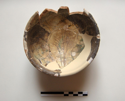 Descrizione Ciotola quasi integra; vasca a calotta emisferica con orlo leggermente ingrossato ed estroflesso; piede a disco lievemente incavato; ingobbio solo all’interno. La vetrina riveste in maniera uniforme entrambi i lati, ad esclusione del fondo (di colore giallo ocra chiaro all’esterno). La decorazione mostra tre foglie cuoriformi riunite in un unico fusto, campite a bande oblique. Il disfacimento parziale dei pigmenti, visibile in corrispondenza del decoro, indica un’esposizione a temperatura troppo elevata. Colori: giallo ferraccia/verde ramina. DecS con vetrina su entrambi i lati