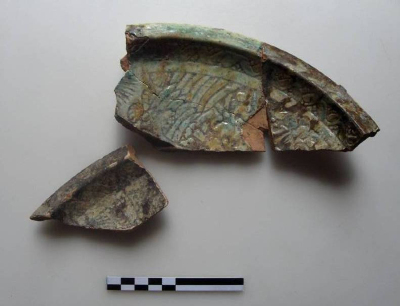 … [leggi tutto] La vetrina è trasparente ed è data sui due lati. Il decoro comprende un motivo principale ed un riempitivo, notevolmente alterati per eccesso di cottura o temperatura eccessiva del forno (disfacimento del pigmento, vacuoli, specialmente sul lato interno); il motivo principale occupa il centro della vasca e mostra un fitto fogliame ed un motivo a recinto (?); esternamente, prima della tesa, teoria a nastro ondulato intrecciato (colori: G/V); dim.: sp. parete 10 mm, largh. tesa 1.6 cm (fr. combacianti). Inv. Dec67