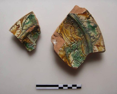 Cfr. per la forma sc. 25PM. Il motivo principale è lacunoso e non appare di facile lettura, mentre per quanto riguarda il tralcio continuo sulla tesa, cfr. ancora sc. 25PM ed ivi bibliografia; pur essendo tra i decori secondari più diffusi sulla graffita rinascimentale, tra i materiali della US1050 se ne registrano pochi esempi.