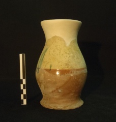 Boccale con corpo ovoide, collo svasato, bocca completamente ricostruita; fondo svasato, piede profilato, piano. Il decoro è rappresentato da un segno grafico non ben definito, al centro della pancia. L’ingobbio copre l’esterno sino a ca. la metà, mentre la vetrina è data su entrambi lati, più spessa sulla parte ingobbiata e con alcune zone scoperte. Colori: verde ramina.
